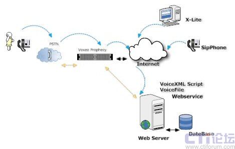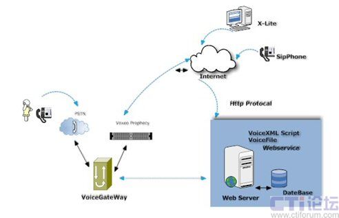 Voxeo Prophecy 是一個(gè)基于SIP、VoiceXML、CCXML標(biāo)準(zhǔn)的語(yǔ)音應(yīng)用開發(fā)和部署平臺(tái),可以讓用戶快速高效的實(shí)施自己的IVR系統(tǒng)。大家都知道,傳統(tǒng)的IVR解決方案廠商,IVR系統(tǒng)架構(gòu)都是基于傳統(tǒng)的CTI硬件來(lái)實(shí)現(xiàn)的,無(wú)論是交換機(jī)方式還是語(yǔ)音卡方式,都是脫離不開硬件廠家的媒體資源。Voxeo Prophecy 是完全基于互聯(lián)網(wǎng)SIP 協(xié)議,同時(shí)也是VoiceXML標(biāo)準(zhǔn)的聯(lián)盟成員,不受任何硬件廠家的硬件限制。VoiceXML 是一種標(biāo)準(zhǔn)的標(biāo)記語(yǔ)言,用于建立語(yǔ)音界面,好比是我們所熟知的HTML 語(yǔ)言,Voxeo Prophecy 可以理解為傳統(tǒng)的語(yǔ)音瀏覽器,可以解釋VoiceXML 腳本并向用戶顯示語(yǔ)音信息,也可以接受用戶的語(yǔ)音請(qǐng)求,實(shí)現(xiàn)互動(dòng)。如下圖所示: