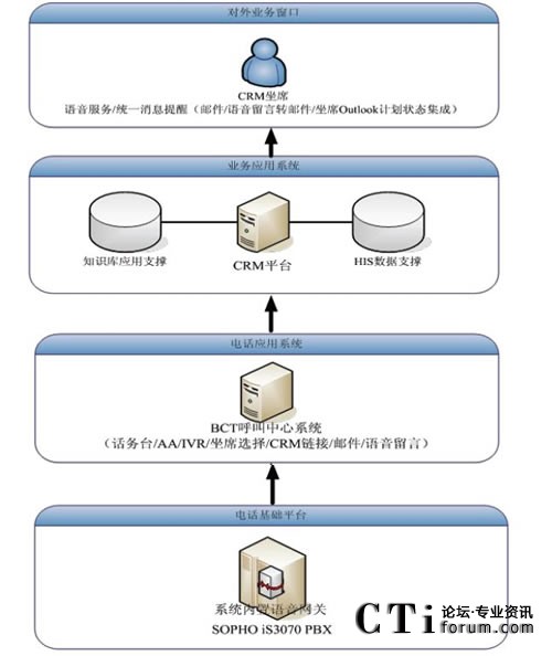 原先電話系統(tǒng)與CRM系統(tǒng)是獨立的兩個系統(tǒng),客服人員面對大量的客戶,迅速的獲悉來電客戶的身份、背景資料以及歷史資料在很大程度上決定了其服務質(zhì)量。BCT呼叫中心系統(tǒng)位于PBX與CRM之間,作為一個中間的橋梁,對PBX送來的電話信息或者用戶輸入的卡號等數(shù)據(jù)進行處理分析,對主叫號碼或用戶輸入卡號進行識別后,傳遞給CRM;CRM檢索與其相連的HIS(醫(yī)院信息系統(tǒng))的數(shù)據(jù)庫,將客戶資料以及相關(guān)的歷史記錄通過彈出網(wǎng)頁的模式,同步的顯示在坐席的計算機上,方便客服代表的輸入和后續(xù)操作,提高了效率與正確率。同時,客戶代表還可以在CRM頁面中點擊電話號碼,通過BCT發(fā)起電話呼叫來聯(lián)系客戶,來處理用戶回訪等工作。