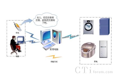 家電遠(yuǎn)控系統(tǒng)的原理是利用電腦或者手機(jī)的電源管理系統(tǒng),來管理用戶終端軟件管理電源的開關(guān)、定時(shí)、預(yù)設(shè)時(shí)間等,利用互聯(lián)網(wǎng)或者手機(jī)網(wǎng)絡(luò)把信號(hào)傳輸?shù)郊彝ル娔X,家庭電腦當(dāng)作小型服務(wù)器或者信號(hào)轉(zhuǎn)發(fā)點(diǎn),把信號(hào)利用藍(lán)牙、zigbee、wifi等無線傳輸?shù)街付ǖ碾娫床遄,?dāng)然每個(gè)電源插座都要有相應(yīng)的信號(hào)接收模塊實(shí)現(xiàn)和家庭電腦的信號(hào)傳輸,實(shí)現(xiàn)了對(duì)電源的管理功能。家電遠(yuǎn)控終端軟件嵌入語音合成軟件,利用合成語音報(bào)讀預(yù)設(shè)的提醒內(nèi)容和時(shí)間提醒,具有危急情況下的報(bào)警功能。當(dāng)然如果我們是在家里,可以直接用手機(jī)通過藍(lán)牙對(duì)電源插座進(jìn)行管理,或者通過家庭電腦進(jìn)行管理。如圖所示: