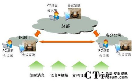 - 多種接入方式的支持:支持桌面方式、支持會議模式、支持VOIP/PSTN、標準硬件終端等多種類型的終端接入。