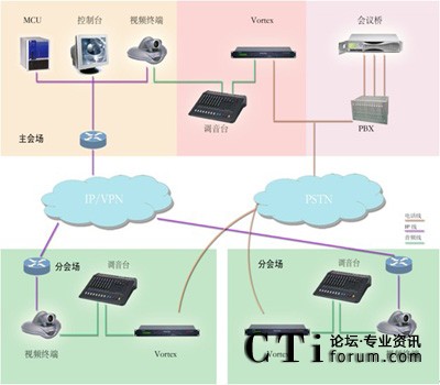 系統(tǒng)基于PSTN電話網(wǎng)絡, 在視頻會議系統(tǒng)中心會場配備一套POLYCOM VORTEX EF2241與會場調(diào)音臺聯(lián)結,并根據(jù)會場數(shù)量配備一套相應方數(shù)的音頻會議橋,各分會場分別配備一套POLYCOM VORTEX EF2211與會場調(diào)音臺聯(lián)結,如用戶無線路條件,也可使用當?shù)剡\營商的電話會議平臺。