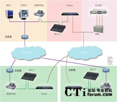 VORTEX 2241或2211與中心會(huì)場的調(diào)音臺(tái)聯(lián)結(jié)),在每個(gè)分會(huì)場根據(jù)會(huì)議規(guī)模分別配備一套POLYCOM會(huì)議電話根據(jù)會(huì)場數(shù)量配備一套相應(yīng)方數(shù)的PSTN音頻會(huì)議橋。