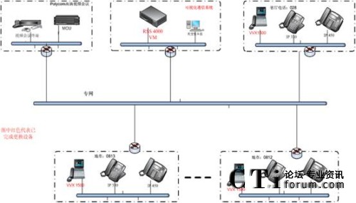 通過網(wǎng)絡還可以將系統(tǒng)與現(xiàn)有高清視頻會議系統(tǒng)進行連接,在VVX1500話機之間實現(xiàn)單點視頻通信的基礎上,實現(xiàn)VVX1500的多點通訊以及和視頻會議終端之間的點對點視頻通信。同時,領導也可以通過MCU加入到視頻會議中實現(xiàn)多方視頻會議,這樣就可以實現(xiàn)領導在辦公室參加視頻會議,而不用每次去會議室開會。