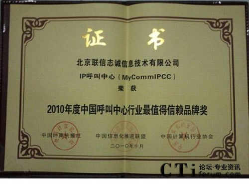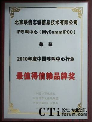 CTI論壇(ctiforum)11月1日消息(記者 潘婷婷):近日,在國家信息化專家咨詢委員會的指導(dǎo)下,作為中國信息化發(fā)展重要推動力量的中國計(jì)算機(jī)報(bào)社、中國計(jì)算機(jī)行業(yè)協(xié)會、中國信息化推進(jìn)聯(lián)盟等國家級權(quán)威媒體及國家信息化領(lǐng)域一級權(quán)威機(jī)構(gòu),共同組織開展“2010中國行業(yè)信息化讀者選擇獎(jiǎng)評選”,重點(diǎn)展示信息化在行業(yè)應(yīng)用中的優(yōu)秀應(yīng)用案例、產(chǎn)品及解決方案。由中國計(jì)算機(jī)報(bào)社組織業(yè)內(nèi)專家,在經(jīng)過歷時(shí)3個(gè)月的產(chǎn)品征集、方案論證、專家評審后,北京聯(lián)信志誠信息技術(shù)有限公司(簡稱MyComm公司),其核心產(chǎn)品MyCommIPCC獨(dú)占2010年中國呼叫中心行業(yè)最值得信賴品牌獎(jiǎng)。