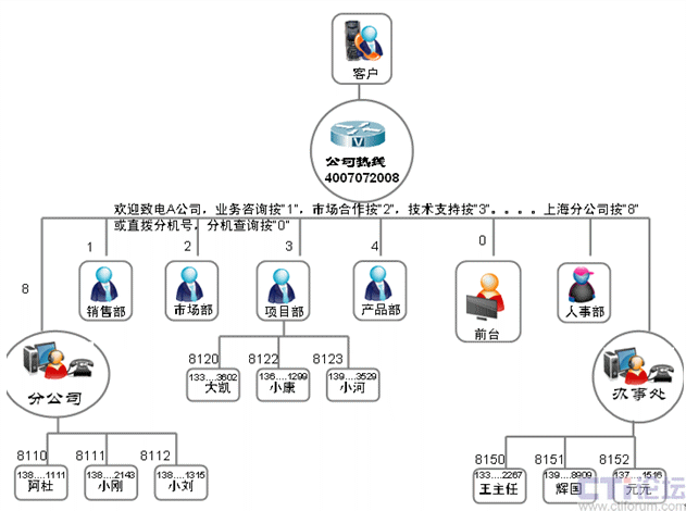 一直以來,呼叫中心座席的形式比較固定,大都通過長期坐在辦公室的人員使用PC機和電話機結(jié)合的方式進行工作。但是,這種形式顯然不能滿足中小企業(yè)運營管理的需要,在以銷售為重的中小企業(yè)中大部分人員并不完全坐在辦公室工作,如客戶經(jīng)理、客戶服務(wù)工程師,即使坐在辦公室,也不會一直在等著接電話,如開發(fā)工程師、生產(chǎn)車間的人員等等。如何既要滿足企業(yè)運營的需要,又要實現(xiàn)呼叫的管理和分配呢?我們只需要將座席的形式簡化,將呼叫分配的目標擴大就可以了。手機是目前最常見和普遍的通信工具,只要我們將手機做為座席進行管理,既不改變現(xiàn)有的組織架構(gòu),又能充分利用呼叫分配工作并對工作人員進行管理,這將大大提高中小企業(yè)運營管理的靈活性和變通性。企業(yè)組織架構(gòu)如下: