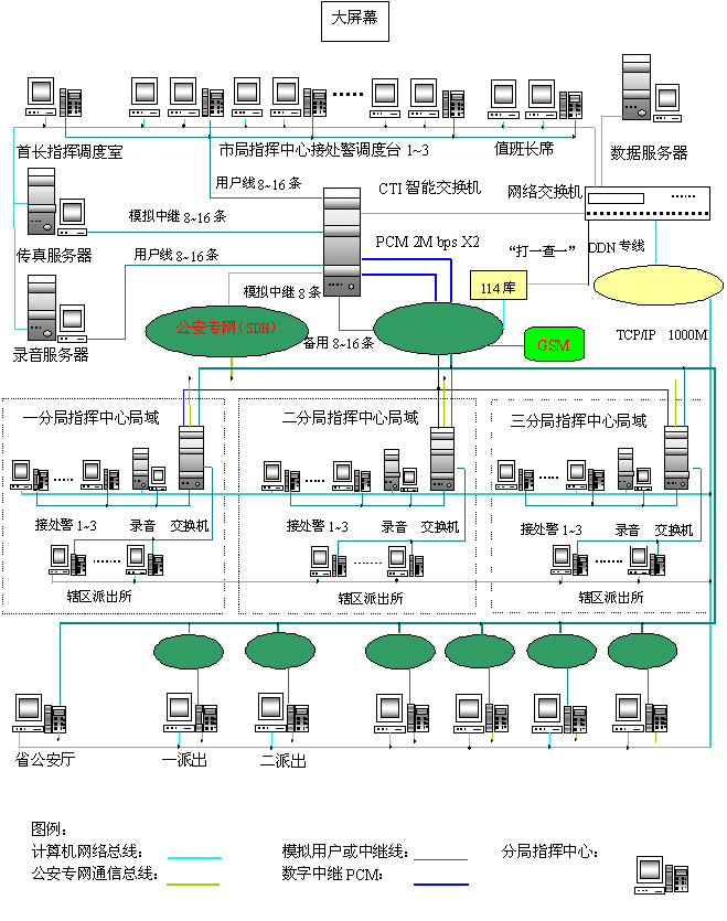 - 樹立大網絡概念:采用先進的通訊、計算機網絡技術(采用CTI可編程交換技術),利用現有的通信資源,實現市局指揮中心與消防大隊、交警大隊、各派出所的計算機網絡及相關領導辦公室計算機大聯網;形成全市范圍內110、119、122有線、無線全方位立體調度語音通道大網。
