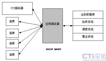 Ο數(shù)據(jù)接口采用三層C/S結(jié)構(gòu),通過構(gòu)建功能強(qiáng)大的應(yīng)用服務(wù)器,把呼叫中心的數(shù)據(jù)流與燃?xì)夤究蛻粝到y(tǒng)、營業(yè)系統(tǒng)、搶修系統(tǒng)和燃?xì)庹{(diào)度系統(tǒng)結(jié)合起來,充分利用了已有系統(tǒng)標(biāo)準(zhǔn)的數(shù)據(jù)接口,實(shí)現(xiàn)對(duì)后臺(tái)數(shù)據(jù)庫的訪問。如圖: