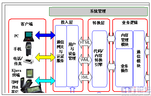 系統(tǒng)支持多種接入設(shè)備,包括廣泛使用的Web瀏覽器、支持WAP或HDML的移動電話、支持Kjava的移動終端、基于PalmOS或WinCE的PDA(個人數(shù)字助理)、傳統(tǒng)的移動電話和尋呼等,并可以方便對于未來的接入設(shè)備進(jìn)行定制。