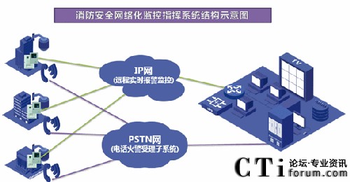 消防網(wǎng)絡(luò)傳輸設(shè)備通過以太網(wǎng)(TCP),電話線(PSTN),無線(GPRS、CDMA)將火災(zāi)報警主機接收到的火警及運行信息上傳的鋼廠消防安全監(jiān)控指揮中心。