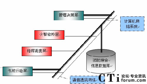 通過對消防安全監(jiān)控指揮中心業(yè)務(wù)的分析,引進先進的數(shù)據(jù)通信網(wǎng)絡(luò)和語音通訊網(wǎng)絡(luò),我們可以將未來的消防業(yè)務(wù)層次抽象地概括為四層(如圖所示):管理決策層、火警監(jiān)測層、指揮調(diào)度層和作戰(zhàn)行動層。與管理決策層對應(yīng)的組織機構(gòu)為消防通信指揮中心;與火警檢測層、指揮調(diào)度層對應(yīng)包括消防指揮中心的接處警子系統(tǒng)、指揮調(diào)度等子系統(tǒng);與作戰(zhàn)行動層對應(yīng)的組織機構(gòu)為消防站(消防隊)和消防車及消防隊員。