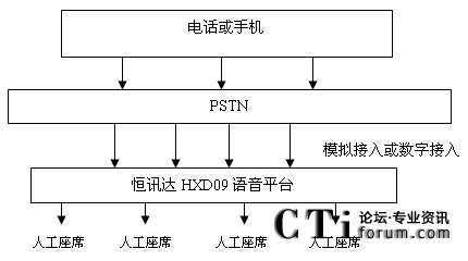 配置恒訊達(dá)公司HXD09的PRI或是7號(hào)信令接入,系統(tǒng)可自動(dòng)與交換機(jī)通信獲取主叫號(hào)碼,話務(wù)員數(shù)量根據(jù)需要配置。