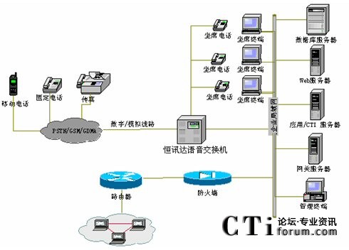 系統(tǒng)采用的硬件根據(jù)實(shí)際需求配置,如果實(shí)際接入電話容量小于30條線,系統(tǒng)與市話要采用普通模擬中繼線接入, 可選擇配置恒訊達(dá)公司HXD09的模擬板(AT0),申請(qǐng)的普通模擬中繼線需開通來電顯示業(yè)務(wù),如電信部門不開通項(xiàng)服務(wù),采用此種接入方式無法實(shí)現(xiàn)來電顯示功能;根據(jù)接入容量和話務(wù)員數(shù)量的總和計(jì)算卡的應(yīng)用數(shù)量,如實(shí)際接入電話容量大于等于30條線,則可采用E1接口數(shù)字中繼線接入,