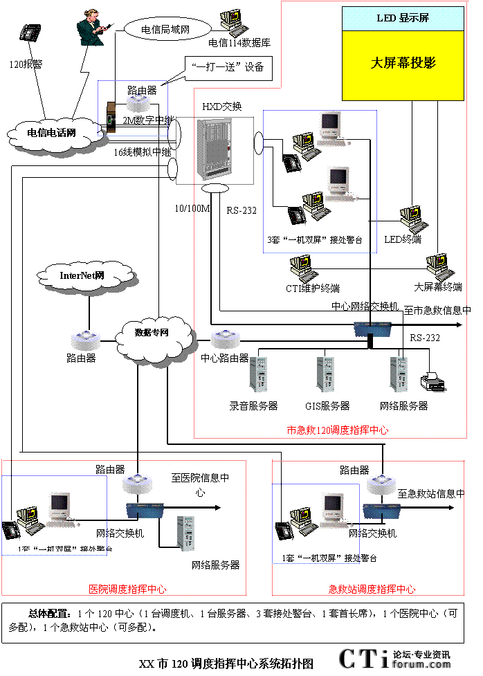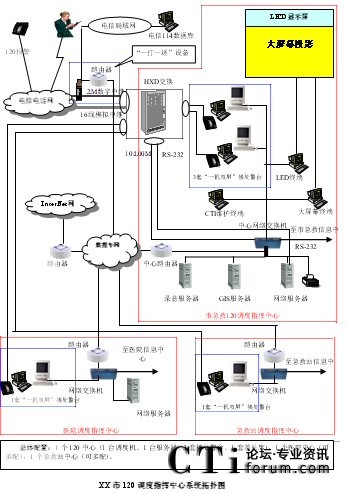 - 樹立大網(wǎng)絡(luò)概念:采用先進的通訊、計算機網(wǎng)絡(luò)技術(shù)(如CTI技術(shù)),利用現(xiàn)有的通信資源,實現(xiàn)市人民醫(yī)院120指揮中心與急救分站的計算機網(wǎng)絡(luò)及相關(guān)領(lǐng)導(dǎo)辦公室計算機大聯(lián)網(wǎng);形成全市范圍內(nèi)120有線、無線全方位立體調(diào)度語音通道大網(wǎng);為今后督查聯(lián)網(wǎng)、大聯(lián)動打下基礎(chǔ)。