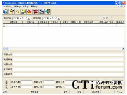 該庫記錄每個120報警被最終處理的全過程,記錄包括報警有關信息、急救措施、調(diào)度命令、涉及的有關人員等信息。每個120報警被記錄后便不允許刪除。系統(tǒng)只允許有權限的用戶進行查詢、統(tǒng)計、匯總、生成報表并打印出來。