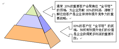 。。從抽象和通用的意義上講,多數(shù)企業(yè)的客戶價值分布是適合"二八法則"的,即20%的客戶創(chuàng)造了80%的利潤。但對每個企業(yè)而言,要洞察"究竟哪些客戶才是最有價值的客戶?""這些客戶在哪些方面的價值最大?""他們有什么共同的特征?"卻不是一件很容易的事。目前,多數(shù)企業(yè)的管理方式還停留在根據(jù)某一項(xiàng)或兩項(xiàng)單一指標(biāo)(如銷售額或利潤)來作的客戶排行,無法進(jìn)行多方位的綜合的客戶價值分析、管理。而要實(shí)現(xiàn)"以客戶為中心"的CRM理念,就必須建立一套全面的客戶價值評估管理系統(tǒng),并利用系統(tǒng)強(qiáng)大的數(shù)據(jù)分析、挖掘功能,快速地進(jìn)行客戶群價值細(xì)分管理,建立起客戶價值金字塔。