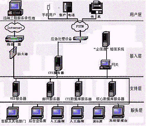 寬帶信息公司目前已建立了完善的客戶資料管理體系,能夠受理客戶客戶的業(yè)務受理、咨詢、投訴建議等,并有自己的郵件服務器和"企信通"短信服務器,因此,應當充分利用公司已有的系統(tǒng)設備,綜合公司實際的業(yè)務管理需要,客戶服務中心的熱線系統(tǒng)采用C/S三層體系結構,而后臺、客戶服務部門及其他部門之間的采用B/S體系結構,實現(xiàn)投訴事件在公司內(nèi)部各部門的傳遞、跟蹤管理,從而整合公司各部門資源為用戶及時周到的提供全程服務。