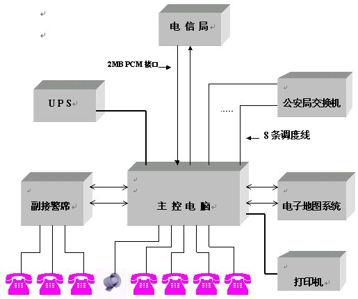 電信局交換機提供單獨數(shù)字2MB PCM中繼接口,通過HDSL傳輸設(shè)備或光端機設(shè)備將中繼接口連接到公安局指揮中心。若電信局與公安局距離小于500米,則可直接使用75歐姆電纜將中繼接口連接到公安局指揮中心。 該數(shù)字2MB PCM中繼接口的數(shù)據(jù)可以作成110/119/122混合編程,數(shù)據(jù)采用收全碼方式,被叫控制掛機。