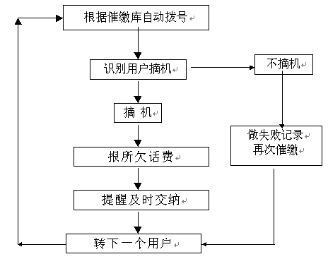 催費工作是由指定的欠費數(shù)據(jù)文件(或欠費數(shù)據(jù)庫)中提取用戶手機號碼和欠費金額,自動順序向各欠費用戶撥號,撥通后自動播放催費通知并通報欠費金額數(shù)。系統(tǒng)自動統(tǒng)計通話結(jié)果,系統(tǒng)對未應(yīng)答用戶會自動重復(fù)多次撥叫。