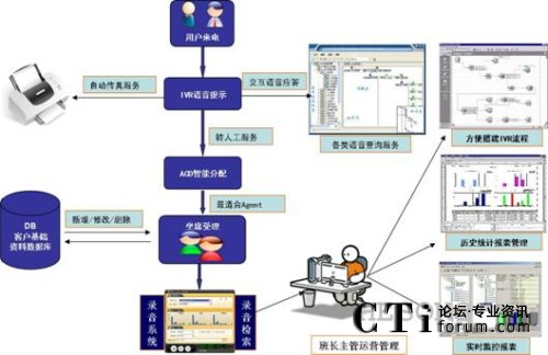 用戶電話呼入時,系統(tǒng)通過自動語音應答的方式,實現(xiàn)用戶服務的自動導航。交互式語音應答功能自動播放問候和語音提示信息,根據(jù)用戶按鍵選擇提供自助服務或者呼叫中心人工服務。呼叫中心提供人工服務后還可以為特定的用戶需求提供人工轉(zhuǎn)IVR自動語音服務,比如114查詢到電話、地址后,電信10000號呼叫中心提供的語音播放服務。