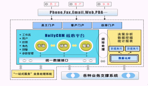 HollyCRM通過(guò)EAI與企業(yè)原有的業(yè)務(wù)系統(tǒng)充分整合,有效解決了阻礙企業(yè)內(nèi)部信息良性流轉(zhuǎn)的"信息孤島"現(xiàn)象。HollyCRM將分析型CRM產(chǎn)生的客戶(hù)價(jià)值和經(jīng)營(yíng)分析結(jié)果實(shí)時(shí)反饋到運(yùn)營(yíng)型CRM中,通過(guò)協(xié)作型CRM提供的接觸渠道,針對(duì)不同客戶(hù)提供個(gè)性化的營(yíng)銷(xiāo)、銷(xiāo)售和服務(wù)活動(dòng)。HollyCRM實(shí)現(xiàn)了整個(gè)企業(yè)信息的閉環(huán)、良性循環(huán)。