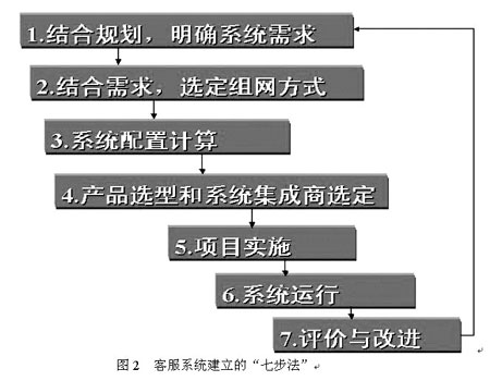 在規(guī)劃了呼叫中心戰(zhàn)略、客服組織架構(gòu)、客服流程與客服績(jī)效考評(píng)之后,呼叫中心系統(tǒng)的建設(shè)就有了戰(zhàn)略層面的規(guī)劃和運(yùn)營(yíng)管理層面的指導(dǎo),而對(duì)戰(zhàn)略管理和運(yùn)營(yíng)管理方面的支持則有賴于客服系統(tǒng)的建立。在戰(zhàn)略管理和運(yùn)營(yíng)管理指導(dǎo)下的客服系統(tǒng)如何具體建立呢?下面分七個(gè)步驟來分別說明: