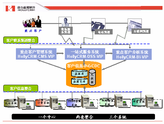 HOLLYCRM(合力金橋軟件)基于電信行業(yè)IT發(fā)展和山東省通信公司重點(diǎn)客戶管理系統(tǒng)建設(shè)目標(biāo)和原則的要求,根據(jù)多年來對電信CRM領(lǐng)域的研究以及在實(shí)際項(xiàng)目建設(shè)實(shí)施過程中的經(jīng)驗(yàn)獲得,科學(xué)地提出了針本項(xiàng)目的"一個中心,二套整合,三個系統(tǒng)"的建設(shè)理念。如下圖: