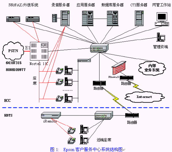 系統(tǒng)承建完成后,把EPSON公司的售前800電話和售后電話整合在一起,用戶可以撥打統(tǒng)一的800電話完成說有的咨詢、投訴工作。因為系統(tǒng)使用了HOLLYCRM(合力金橋軟件)公司的CTI產(chǎn)品-HollyContact3.0,它支持先進的路由方式,可以讓客戶電話路由到最合適的話務(wù)員接聽,提高了工作效率和服務(wù)質(zhì)量。系統(tǒng)采用了先進的B/S結(jié)構(gòu),這樣各地市辦事處和維修中心通過愛普生公司內(nèi)部網(wǎng)路被緊密的連接在了一起,客服中心受理用戶投訴或者需求信息后可以直接給各地市辦事處和維修中心派發(fā)工單。