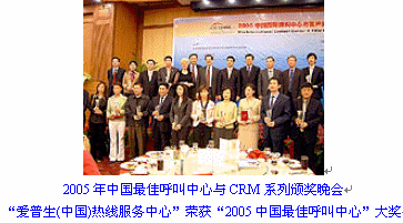 EPSON(中國)客服系統(tǒng)榮獲了"2005中國最佳呼叫中心"大獎。 由信息產(chǎn)業(yè)部中國信息化推進聯(lián)盟客戶關(guān)系管理專業(yè)委員會、CTI論壇客戶關(guān)系管理學(xué)院共同舉辦的2005