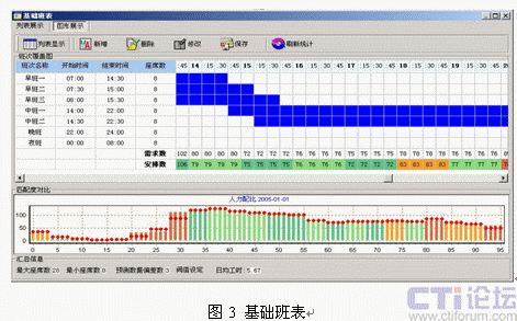 引入呼叫中心排班系統(tǒng)是提升坐席資源利用率的有效解決方案,排班系統(tǒng)可以對(duì)大量的歷史呼叫數(shù)據(jù)進(jìn)行分析,并剔除特殊事件對(duì)呼叫量的影響,從而得出呼叫量變化的規(guī)律曲線,再輔助對(duì)特殊預(yù)期事件影響度的疊加,可以對(duì)未來(lái)一定時(shí)間的呼叫量變化做出比較客觀的預(yù)測(cè)(圖2)。在預(yù)測(cè)話(huà)務(wù)量變化曲線的同時(shí),結(jié)合人員技能和班次設(shè)定,給出高擬合度的人工排班方案(圖3)。更為重要的是,成熟排班系統(tǒng)提供的話(huà)務(wù)預(yù)測(cè)模型多具備學(xué)習(xí)能力,能夠?qū)㈩A(yù)測(cè)的話(huà)務(wù)數(shù)據(jù)與實(shí)際話(huà)務(wù)數(shù)據(jù)進(jìn)行對(duì)比,從而不斷提高話(huà)務(wù)預(yù)測(cè)模型的預(yù)測(cè)精度。成熟排班工具可以在保持呼叫中心同等服務(wù)水平的前提下,降低人工坐席代表的投入數(shù)量,進(jìn)而釋放部分人工資源開(kāi)展其它業(yè)務(wù)。