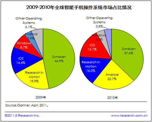 根據(jù)Gartner最新發(fā)布的數(shù)據(jù)可以看到,智能手機(jī)操作系統(tǒng)市場(chǎng)占比情況從2009年到2010年變化很大,Symbian仍然是占比最大的操作系統(tǒng),但是,其下降趨勢(shì)可見一斑。而Android和iOS則快速增長(zhǎng),2010年Android以22.7%的市場(chǎng)份額位列第二。經(jīng)過2011年的發(fā)展,這一市場(chǎng)格局還將有新的變化。