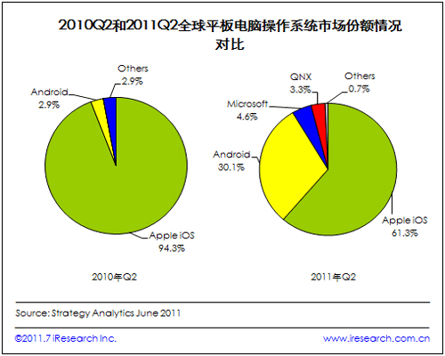 從平板電腦操作系統(tǒng)出發(fā),根據(jù)Strategy Analysis發(fā)布的數(shù)據(jù),2011Q2iOS的市場(chǎng)占比最大,為61.3%,其次為Android,占比為30.1%,windows以4.6%的占比位列第三。在平板電腦上,由于發(fā)展時(shí)間較短,競(jìng)爭(zhēng)格局會(huì)比智能手機(jī)市場(chǎng)簡(jiǎn)單一些。隨著市場(chǎng)的發(fā)展逐漸成熟,可以預(yù)見,iOS的市場(chǎng)份額還將進(jìn)一步下降,而Android和Windows的市場(chǎng)占比則會(huì)上升。
