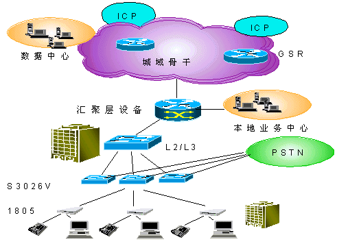 在用戶接入層Quidway S3026V提供24路VDSL接入,在普通雙絞線上提供12Mbps的雙向?qū)ΨQ數(shù)據(jù)業(yè)務,傳輸距離最大可達1500m,在完成以太網(wǎng)接入的同時,不影響POTS業(yè)務。S3026V上行FE接口直接接入L3交換機。同時,通過雙絞用戶線完成了與PSTN交換機的相連,將寬帶、窄帶業(yè)務在S3026V上匯合,并通過已有雙絞電話線連接至遠端用戶設備(1805)。1805可以通過五類線與計算機網(wǎng)卡相連。