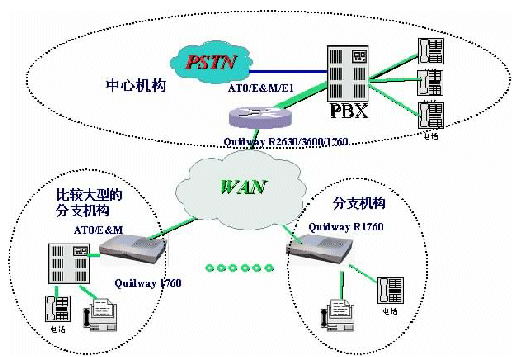 。。如圖是一個典型的企業(yè)網(wǎng)IP電話組網(wǎng)方案,在總部采用Quidway®R3640E/3680E路由器作為中心語音網(wǎng)關(guān)設備,在E1線路上實現(xiàn)VoIP功能;如果機構(gòu)規(guī)模不是很大,也可以采用AT0/E&M連接PBX;在各分支機構(gòu)及網(wǎng)點,則可采用Quidway®