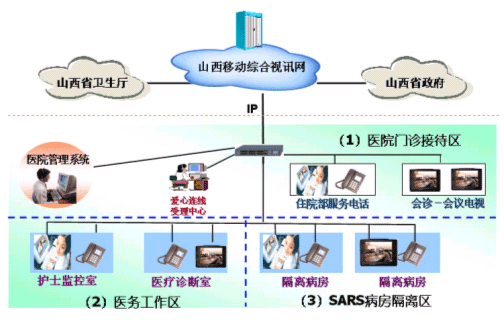 。。山西移動通信公司在獲悉遠程視訊業(yè)務(wù)可以有效預防SARS的情況下,隨即與山西省政府、省衛(wèi)生廳通電話,表達了山西移動愿意為山西防治SARS工作提供更先進的通信技術(shù)支持。山西移動與華為技術(shù)有限公司旋即制定了“愛心連線”遠程醫(yī)療、遠程探視實施方案,省衛(wèi)生廳及下屬太原市7家醫(yī)院要求盡快實施。目前該系統(tǒng)已經(jīng)在山西省山大第一醫(yī)院開通,正值國家衛(wèi)生部SARS督察小組在山西各大醫(yī)院視察“防非”工作,整個系統(tǒng)運行穩(wěn)定,在SARS的防治工作中發(fā)揮了重要作用。