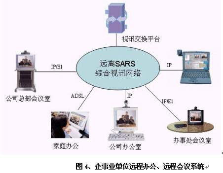非典型肺炎不但對(duì)國(guó)家的經(jīng)濟(jì)造成了重大的損失,而且使得全社會(huì)對(duì)"非典"噤若寒蟬,大家對(duì)出差甚至外出都異常緊張。華為公司提供為個(gè)人家庭辦公、探親訪友的遠(yuǎn)程多媒體通信解決方案,大家在家里即可通過網(wǎng)絡(luò)和親朋好友"面對(duì)面"交流、在家中辦公。減少外出、遠(yuǎn)離人員眾多地區(qū),有效預(yù)防非典。對(duì)于有條件的用戶群可以推薦在現(xiàn)有寬帶線路或新增寬帶線路上購買軟件,即可實(shí)現(xiàn)親朋好友間的個(gè)人視頻通信;對(duì)于暫不具備寬帶條件的群體,如學(xué)生等,可以考慮在重點(diǎn)營(yíng)業(yè)廳設(shè)立專門會(huì)議室或者視訊公話亭等,提供預(yù)約視頻服務(wù),滿足其溝通的需求。