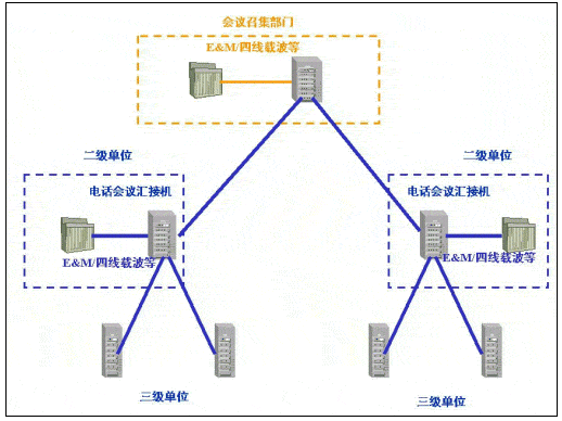 當前國內(nèi)許多行業(yè)由于行業(yè)的業(yè)務特點,在原有的電話網(wǎng)應用中,電話會議作為常用的交流手段發(fā)揮著重要作用。這些行業(yè)的電話會議業(yè)務,主要是通過電話會議匯接機的方式實現(xiàn):會議召集單位通過電話會議匯接機(以下簡稱匯接機)通過專線、撥號等方式連通下級單位(以下簡稱二級單位)的匯接機,二級單位的匯接機通過專線、撥號等方式連通所轄單位(以下簡稱三級單位)的會場電話。這樣通過多級匯接機級連的方式實現(xiàn),主持單位和二、三級單位間的電話網(wǎng)連通,利用匯接機實現(xiàn)廣播、三方通話、調(diào)度發(fā)言單位等會議功能。