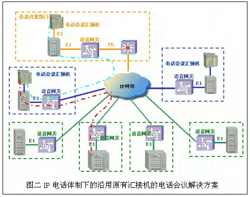 伴隨著IP網(wǎng)的建設和VoIP電話系統(tǒng)標準的日益完善,許多行業(yè)、部門開始在建設IP數(shù)據(jù)網(wǎng)的同時,結(jié)合原有電話專網(wǎng)的改造,著手建設IP電話網(wǎng)絡。在IP電話網(wǎng)上實現(xiàn)原有的電話會議業(yè)務也就隨之提到日程上來。華為公司結(jié)合IP電話的特點和保護用戶已有投資的角度,提出延用電話會議匯接機和采用華為專用IP電話會議控制系統(tǒng)兩套解決方案: