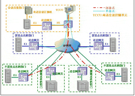 采用原有的會議電話架構,只是話音的長途連接由模擬專線等改為IP傳輸。方案由于采用原有電話會議匯接機,保護了用戶的原有投資。缺點是在召開多級會議電話時,由于語音信號首先在召集單位語音網(wǎng)關進行壓縮,經(jīng)IP傳輸后,在二級單位語音網(wǎng)關解壓縮還原為模擬話音,再經(jīng)二級單位的語音網(wǎng)關二次壓縮,經(jīng)IP網(wǎng)傳輸后,在三級單位的語音網(wǎng)關上二次解壓縮,導致語音信號多次壓縮/還原,對語音質(zhì)量損傷較大。