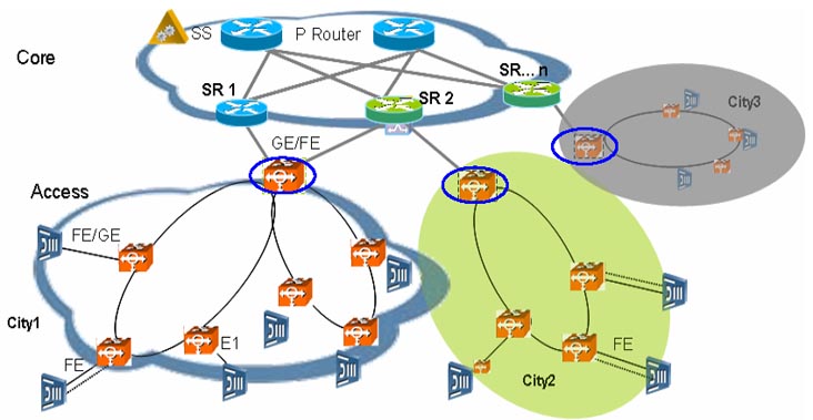 綜合接入主要關(guān)注語音和少量寬帶業(yè)務(wù)和專線,上行接口一般是E1和FE/GE。傳統(tǒng)窄帶語音業(yè)務(wù)、TDM專線等或MSAN使用于窄帶交換機(jī)組網(wǎng)的時候采用E1上行方式,其它時候采用FE/GE上行。接入層面采用的承載網(wǎng)設(shè)備必須同時能夠支持E1和FE/GE接入,因此承載網(wǎng)設(shè)備必須具備多業(yè)務(wù)傳輸特性,傳統(tǒng)SDH設(shè)備,傳統(tǒng)LANSwitch設(shè)備無法滿足組網(wǎng)需求。