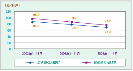 圖二:2002~2004年同期固網(wǎng)通信與移動(dòng)通信ARPR比較(中國信息產(chǎn)業(yè)部)