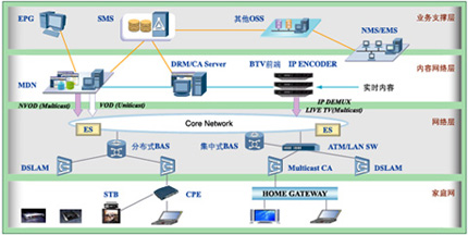 華為IPTV城域網(wǎng)解決方案,由業(yè)務(wù)支撐系統(tǒng)、內(nèi)容網(wǎng)絡(luò)系統(tǒng)、骨干承載網(wǎng)、接入網(wǎng)絡(luò)幾個(gè)部分組成。業(yè)務(wù)支撐系統(tǒng)和內(nèi)容網(wǎng)絡(luò)系統(tǒng)實(shí)現(xiàn)業(yè)務(wù)的管理和提供;網(wǎng)絡(luò)層和接入網(wǎng)以及用戶端設(shè)備配合完成業(yè)務(wù)的接入、控制、管理、QOS保障和安全。