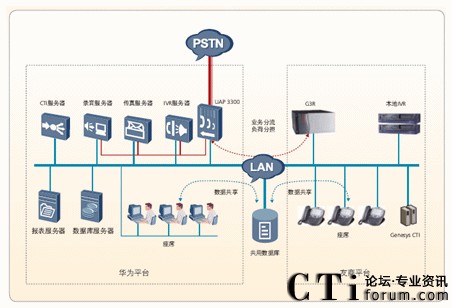 客戶電話通過PSTN統(tǒng)一由華為UAP3300排隊機接入,由華為平臺的IVR服務(wù)器進行業(yè)務(wù)導(dǎo)航分流,根據(jù)用戶的選擇和IVR流程的配置進行路由,可以選擇不同平臺來處理此業(yè)務(wù)。來話根據(jù)IVR流程路由后,兩個平臺采用負(fù)荷分擔(dān)方式進行工作。在將來話導(dǎo)入兩個平臺后,采用不同設(shè)備的IVR進行業(yè)務(wù)分配,不同平臺的座席處理不同的業(yè)務(wù)。在處理過程中,不同平臺的座席之間可以互轉(zhuǎn),達(dá)到全網(wǎng)資源共享的功能。