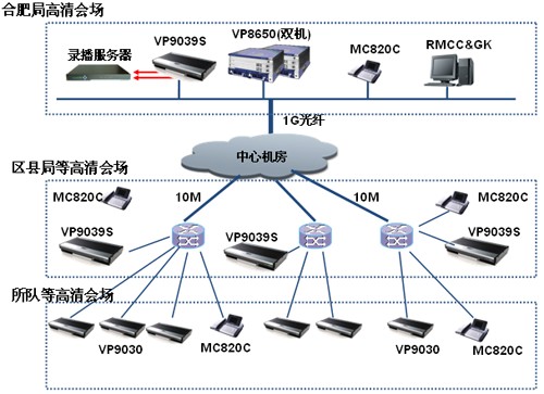 為滿足安徽省煙草合肥市公司日常工作會(huì)議、集中培訓(xùn)、遠(yuǎn)程匯報(bào)等工作業(yè)務(wù)需求,同時(shí)為應(yīng)對(duì)突發(fā)事件提供可靠可行的交互平臺(tái),實(shí)現(xiàn)多地點(diǎn)、遠(yuǎn)距離的視頻、音頻和數(shù)據(jù)的互通交流。深圳市金華威數(shù)碼科技有限公司工程師建議新建的視訊系統(tǒng)采用高清的視頻會(huì)議組網(wǎng)模式,其中市局、三縣與區(qū)局、所隊(duì)及營(yíng)銷部所有會(huì)場(chǎng)節(jié)點(diǎn)建設(shè)高清視頻會(huì)議系統(tǒng)。