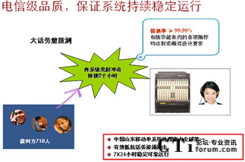 華為聯(lián)絡(luò)中心系統(tǒng)具有高穩(wěn)定性、高可靠性、易擴(kuò)展性和可維護(hù)性。這主要源于華為對電信網(wǎng)絡(luò)現(xiàn)狀與演進(jìn)的理解,源于華為擁有固定、移動(dòng)和IP三個(gè)網(wǎng)絡(luò)方面綜合實(shí)力。華為數(shù)以千計(jì)的核心平臺(tái)開發(fā)測試人員,幾十種極端環(huán)境(如超大話務(wù)量、溫差、濕度、鹽堿度、缺氧等),磨礪出的是世界級(jí)的高品質(zhì)。麥加朝圣10KM內(nèi)密集200萬移動(dòng)用戶,大部分為國際漫游,整齊劃一的用戶行為,形成連日多波話務(wù)尖峰,網(wǎng)絡(luò)受不均衡沖擊,系統(tǒng)容易雪崩。使用華為方案STC連續(xù)四年征服HAJJ期間話務(wù)高峰,告別系統(tǒng)每逢朝圣就癱瘓歷史。正是繼承了這樣的DNA,我們在某移動(dòng)運(yùn)營商聯(lián)絡(luò)中心系統(tǒng)單點(diǎn)實(shí)測BHCC1200K,每天平均呼叫量為600萬次,一套系統(tǒng)支撐著2000多座席和近8000路IVR。