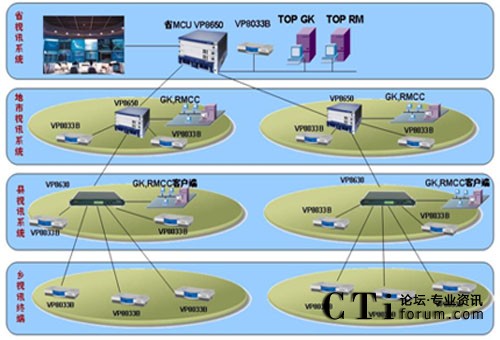 這是目前國內(nèi)最大的政府應急視頻會議指揮系統(tǒng),現(xiàn)網(wǎng)可以借鑒的經(jīng)驗很少,華為公司充分意識到該項目的重大意義,投入大量人力物力進行網(wǎng)絡環(huán)境調(diào)研和客戶需求分析,經(jīng)過眾多專家和工程人員的反復論證,最終該套系統(tǒng)采取了分布式三級級聯(lián)組網(wǎng)結構和四級分級分權管理模式,具有強大的備份能力和豐富的功能特性,在省和9個地市分別配置1臺8650MCU和1套管理軟件,在58個縣分別配置1臺8630 MCU,在1205個會議室分別配置1臺8033B終端。