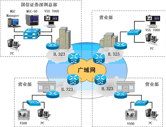 國信證券有限責(zé)任公司為全國性大型綜合類證券公司,總部在深圳,在全國二十一個城市擁有二十多家營業(yè)部及服務(wù)網(wǎng)點。隨著國信證券規(guī)模的不斷擴大和內(nèi)外交流的增加,公司領(lǐng)導(dǎo)希望借助視頻會議的高效、快捷等特點,提高管理效率、統(tǒng)一管理、降低企業(yè)的管理運作成本、減少公司的巨額通訊費用和差旅費用。