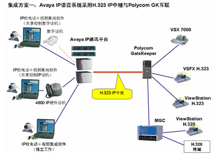 方式一:Polycom GK采用H.323 IP 中繼與AvayaIP語(yǔ)音系統(tǒng)集成。