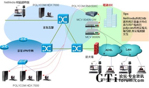 京東商城的NetMedia軟視頻會(huì)議MCU設(shè)備MCV8000N安裝在聯(lián)通的IDC,有10個(gè)倉(cāng)儲(chǔ)的網(wǎng)絡(luò)視頻會(huì)議室安裝硬件終端MCV2000N,另外40個(gè)倉(cāng)儲(chǔ)是在網(wǎng)絡(luò)視頻會(huì)議室的PC機(jī)上安裝一套NetMedia客戶端程序,各會(huì)議室終端通過ADSL撥號(hào)、3G無(wú)線上網(wǎng)、公司VPN專網(wǎng)等方式接入NetMedia軟視頻會(huì)議MCU。該系統(tǒng)以良好的網(wǎng)絡(luò)適應(yīng)性運(yùn)行在互聯(lián)網(wǎng)上,可保證音視頻低延時(shí)、高保真的交互,使各倉(cāng)儲(chǔ)間的技術(shù)交流和庫(kù)存數(shù)據(jù)交換常態(tài)化,為各地倉(cāng)儲(chǔ)間庫(kù)存數(shù)據(jù)交換、貨物調(diào)配提供了實(shí)時(shí)、快捷的溝通渠道。
