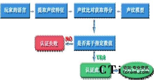 聲紋認證是用戶通過電話至服務器端,服務器根據(jù)用戶注冊的聲紋來識別,通過認證則為合法用戶,否則為非法用戶。認證成功后,服務器端給予用戶一組動態(tài)數(shù)字,再結(jié)合靜態(tài)密碼,這樣可大幅提高用戶在網(wǎng)絡游戲中的安全性。(如下圖)