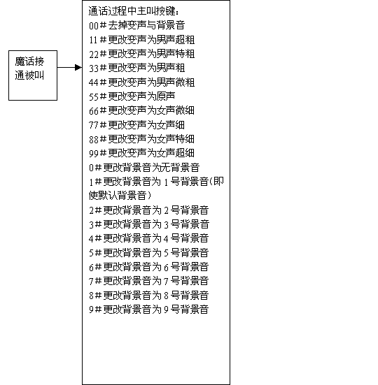 變聲通話功能也叫魔話功能,是指用戶通過(guò)通過(guò)播打特殊的號(hào)碼接入到本平臺(tái)后,再通過(guò)本平臺(tái)去呼叫最終的被叫用戶,在這樣的一個(gè)通話過(guò)程中,可以通過(guò)本平臺(tái)提供8級(jí)變聲和原聲功能:"男聲超粗、男聲特粗、男聲粗、男聲微粗、原聲、女聲微細(xì)、女聲細(xì)、女聲特細(xì)、女聲超細(xì)"。在通話過(guò)程中實(shí)時(shí)變聲,并可按鍵選擇改變變聲系數(shù)或恢復(fù)原聲,趣味非凡,超常體驗(yàn)。